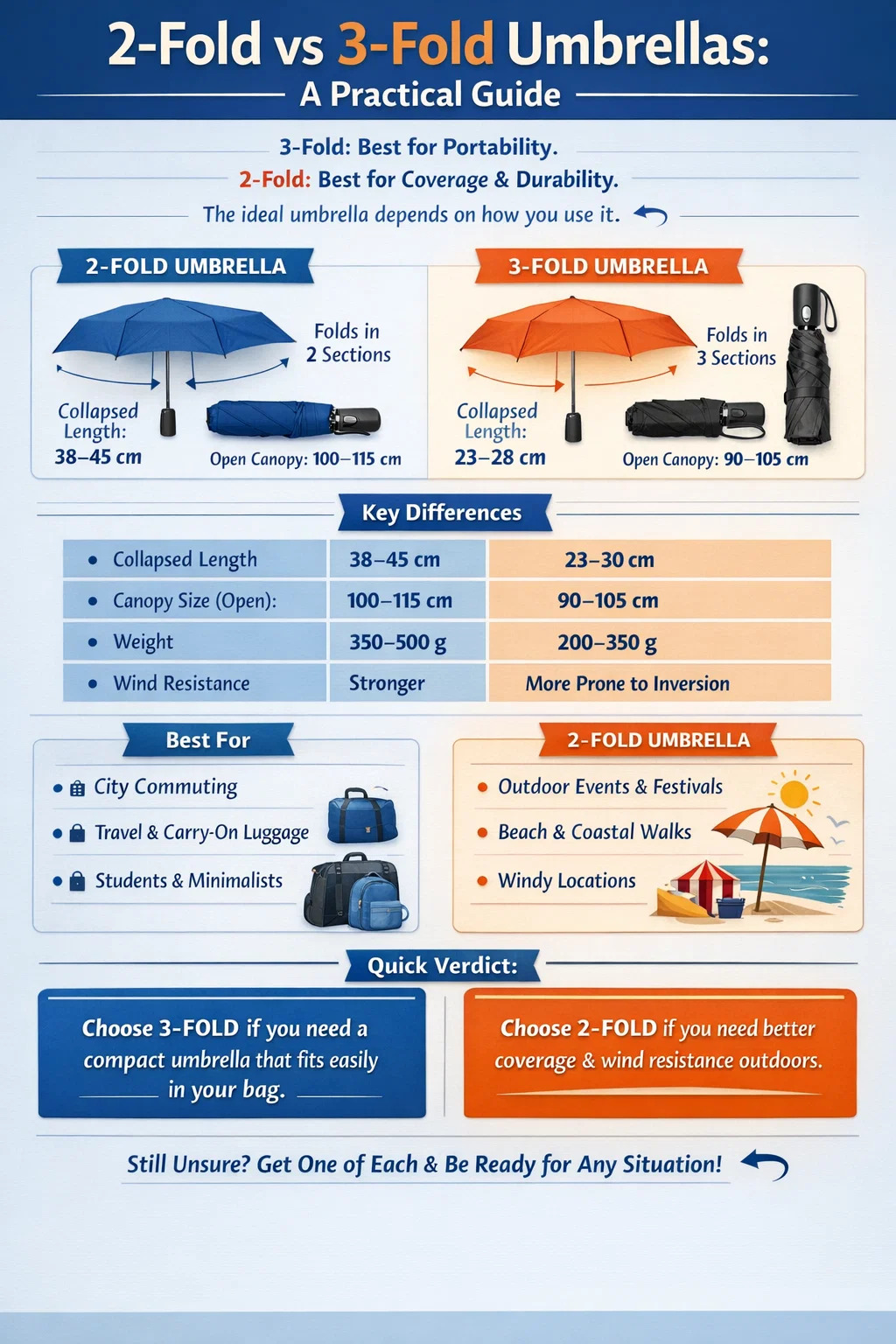 Se você precisa de um guarda-chuva para deslocamento diário, uso no escritório ou viagens onde o espaço para bagagem é apertado, um guarda-chuva triplo é quase sempre a melhor escolha . Ele cai para cerca de 23–28 cm, cabe no bolso de uma jaqueta ou em uma bolsa pequena e é leve o suficiente para ser carregado sem perceber. Se, por outro lado, você passa muito tempo ao ar livre – seja para uma praia, um estádio ou uma feira rural – um guarda-chuva duplo oferece uma cobertura visivelmente maior, uma estrutura mais robusta e melhor resistência ao vento, ao custo de ser mais volumoso para transportar.