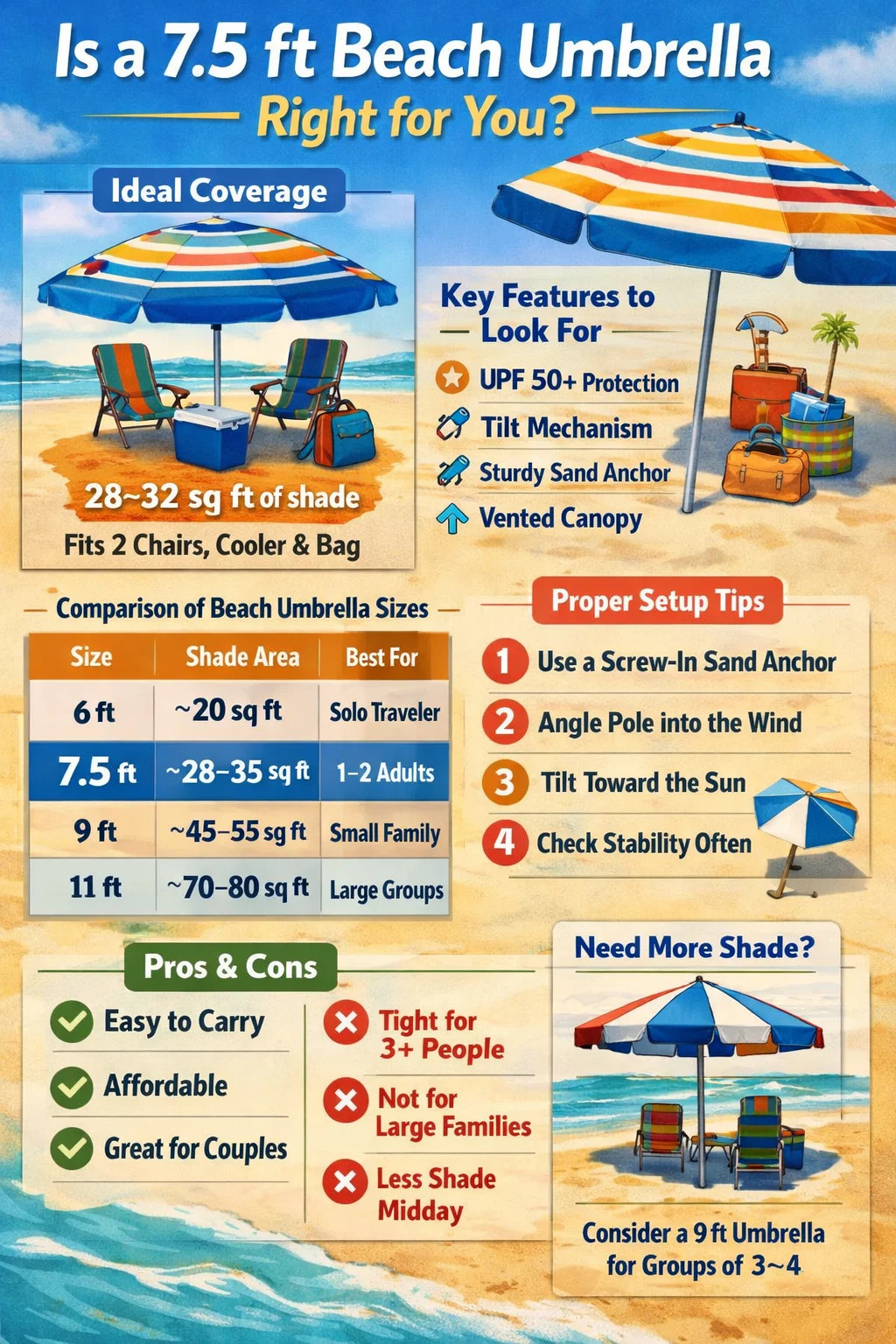Se você tem filhos pequenos, lembre-se de que eles tendem a se espalhar. Um guarda-chuva de 7,5 pés funciona para um adulto e uma ou duas crianças pequenas, mas dois adultos com crianças ativas podem se sentir apertados. Nesse caso, dois guarda-chuvas separados de 7,5 pés lado a lado é uma solução comum que muitos banhistas experientes preferem em vez de um único dossel grande que é mais difícil de ancorar.