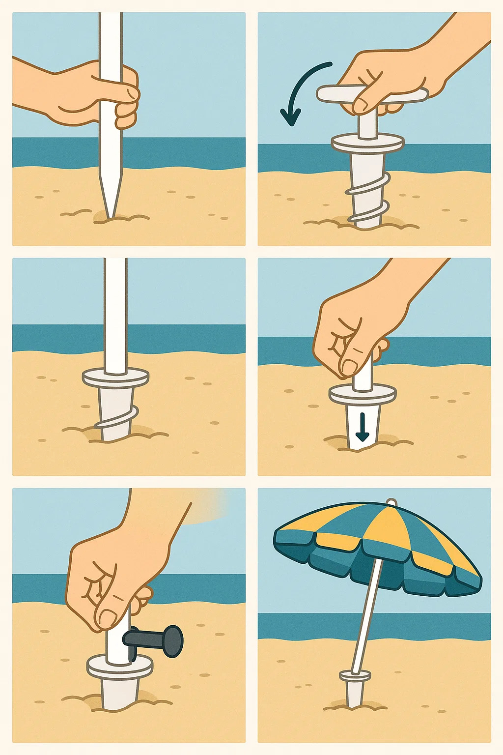 Profundidade: Continue girando até que a maior parte da âncora de areia ou da base do parafuso do guarda-sol (geralmente mais de dois terços, de preferência toda a seção do parafuso) esteja enterrada na areia, deixando apenas a abertura superior para inserir o mastro do guarda-sol exposta acima da areia. Quanto mais fundo estiver enterrado, melhor será o efeito de ancoragem.