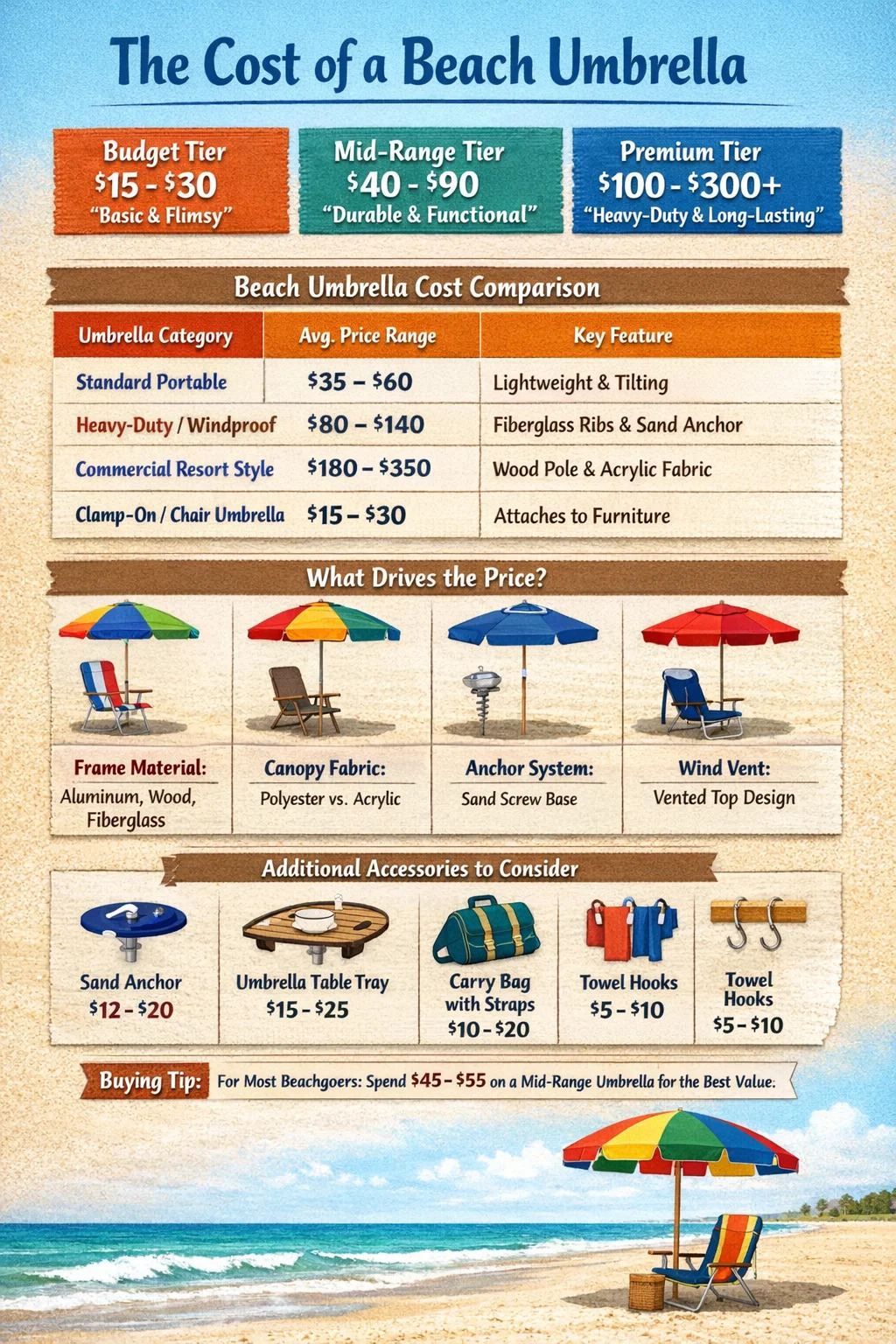 Se você estiver indo para a costa, um padrão e confiável guarda-sol normalmente custa entre US$ 35 e US$ 75 . Essa faixa de preço geralmente cobre modelos com capota de 6 a 7 pés, um mecanismo básico de inclinação e um forro de proteção UV revestido de prata. Contudo, o mercado é amplo; você pode encontrar guarda-chuvas "descartáveis" básicos em lojas locais de calçadão por apenas $ 15 a $ 25 , enquanto estruturas de sombra de nível comercial de alta qualidade projetadas para resistir a ventos fortes podem atingir preços de $ 150 a $ 300 ou mais .