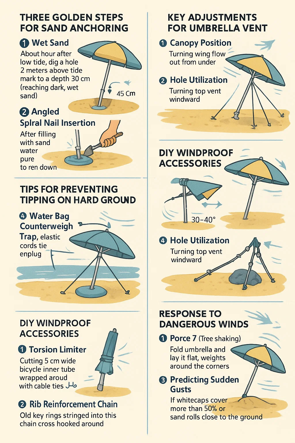 Posição do dossel: Quando o vento aumentar, incline imediatamente o guarda-chuva 30-40° para permitir que o vento flua para fora do guarda-chuva, em vez de subir para dentro dele (com as costelas paralelas à direção do vento).
