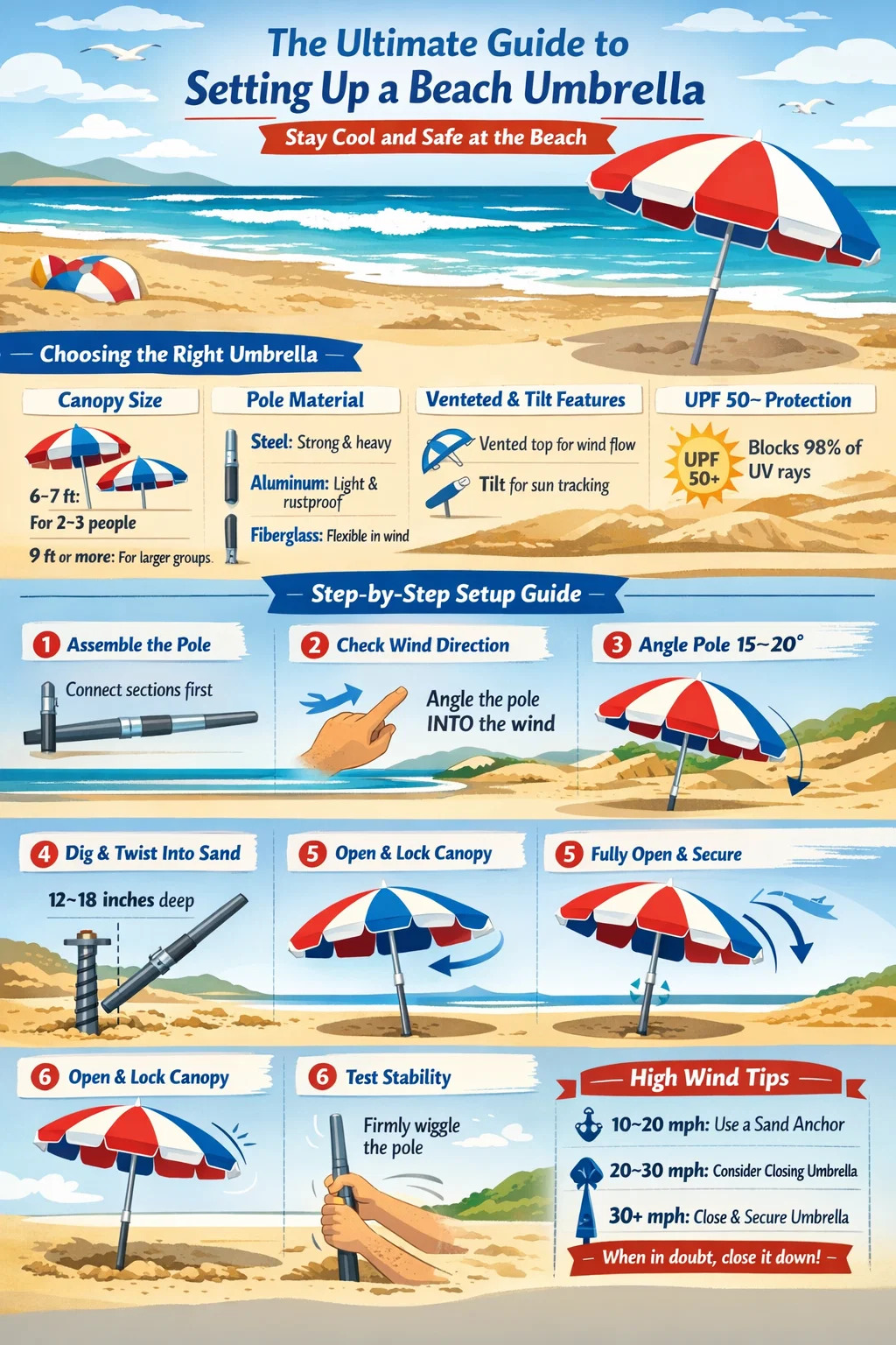 Este guia cobre cada etapa detalhadamente – desde a escolha do guarda-sol certo até mantê-lo estável em rajadas de mais de 32 km/h – para que você possa gastar menos tempo lutando com o equipamento e mais tempo aproveitando a água.