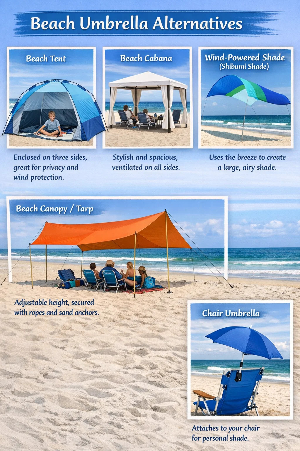 Se você acha que carregar ou montar um guarda-sol é muito problemático, ou se preocupa com a possibilidade de ele ser levado pelo vento, existem muitas alternativas mais estáveis com áreas sombreadas maiores disponíveis no mercado.