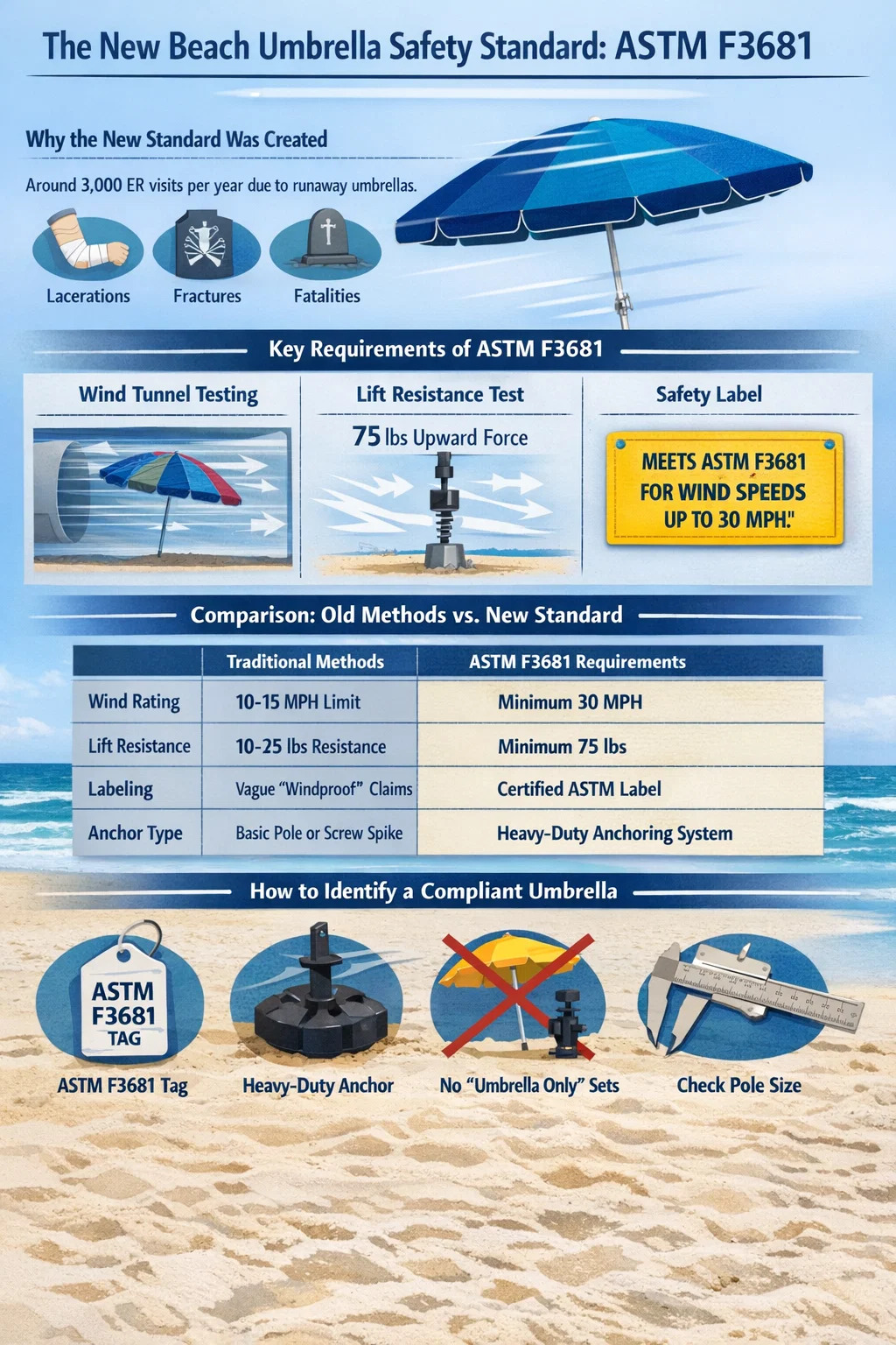 Durante décadas, o design do guarda-sol foi deixado em grande parte sem regulamentação, causando milhares de feridos todos os anos. Dados da Consumer Product Safety Commission (CPSC) indicaram que aproximadamente 3.000 pessoas são atendidas em pronto-socorros anualmente devido a ferimentos causados por guarda-chuvas descontrolados. Esses incidentes geralmente envolvem o guarda-chuva se tornando um projétil perigoso em rajadas repentinas, causando lacerações, fraturas e até mesmo mortes. A norma ASTM F3681 foi desenvolvida para forçar uma mudança na indústria em direção a mecanismos de ancoragem testados cientificamente.