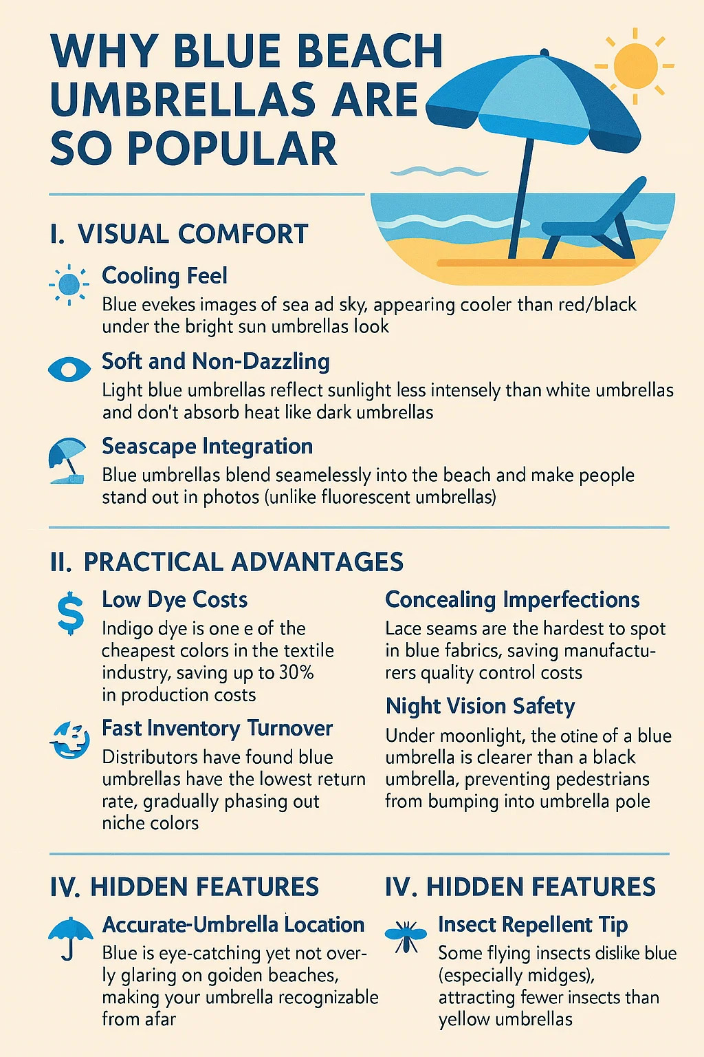 * **Segurança de visão noturna:** Sob o luar, o contorno de um guarda-chuva azul é mais claro do que um guarda-chuva preto, evitando que os pedestres esbarrem no mastro do guarda-chuva.